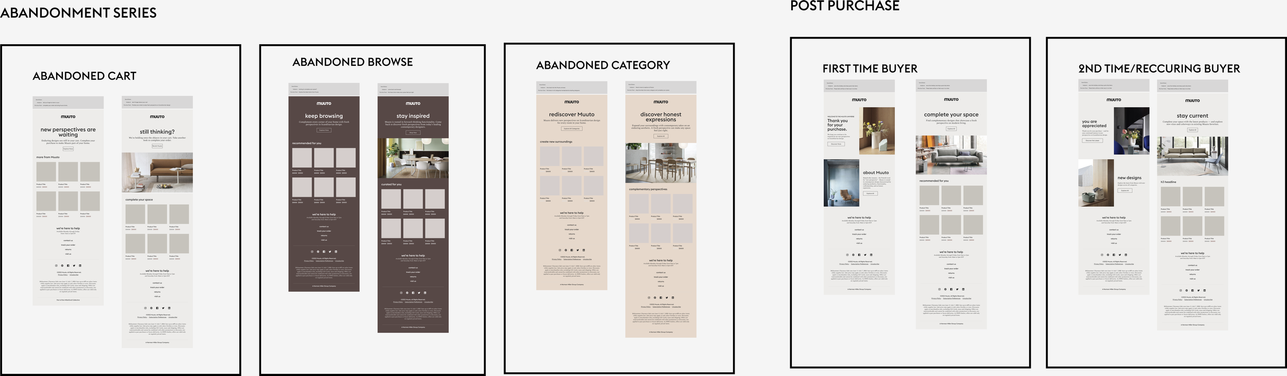 We began using a new email service provider, Zeta, therefore we needed to ideate a completely new email program, starting with 0 subscribers. Created Welcome journey, Abandonment Series, Post Purchase, Win-Back Series, and Wishlist campaigns to align with Muuto’s branding. We launched our first acquisition strategy as a sweepstake on Dwell.com. In order to win, entrants clicked through to a cloud page and entered their email. This garnered over 11K entries and 6K subscribers to our email program.